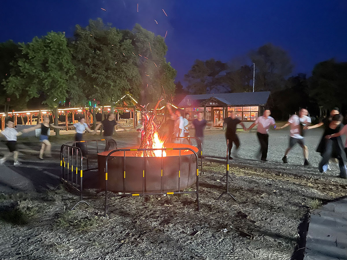 晚上的篝火晚會別開生面,大家手牽手心連心,圍成一圈,載歌載舞,氣氛被推向了高潮。
